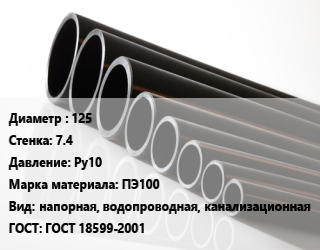 Труба полиэтиленовая 125х7.4 Ру10 ПЭ100 напорная, водопроводная, канализационная ГОСТ: ГОСТ 18599-2001