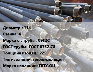 Труба предизолированная 114 s=4 Сталь: 09Г2С ГОСТ: ГОСТ 8732-78 s изоляции=225 теплоизоляция ППУ-ОЦ