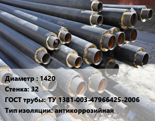 Труба предизолированная 1420 s=32 ГОСТ: ТУ 1381-003-47966425-2006 антикоррозийная