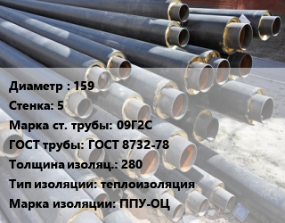 Труба предизолированная 159 s=5 Сталь: 09Г2С ГОСТ: ГОСТ 8732-78 s изоляции=280 теплоизоляция ППУ-ОЦ