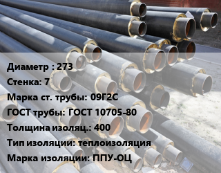 Труба предизолированная 273 s=7 Сталь: 09Г2С ГОСТ: ГОСТ 10705-80 s изоляции=400 теплоизоляция ППУ-ОЦ