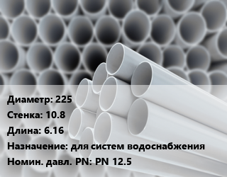 Труба ПВХ, поливинилхлорид 225 s=10.8 L=6.16 для систем водоснабжения PN 12.5