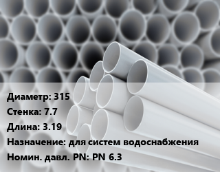 Труба ПВХ, поливинилхлорид 315 s=7.7 L=3.19 для систем водоснабжения PN 6.3