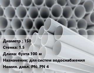 Труба ПВХ, поливинилхлорид 150 s=1.5 L=бухта 100 м для систем водоснабжения PN 4