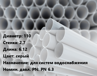Труба ПВХ, поливинилхлорид 110 s=2.7 L=6.12 серый для систем водоснабжения PN 6.3