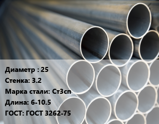 Труба водогазопроводная ВГП 25 s=3.2 Сталь: Ст3сп L=6-10.5 ГОСТ: ГОСТ 3262-75, н/д, по запросу цена от 68 053 сом / т, где купить, условия доставки в Бишкеке и Чуйской области