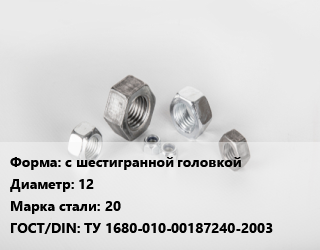 Гайка с шестигранной головкой D=12 Сталь: 20 ТУ 1680-010-00187240-2003