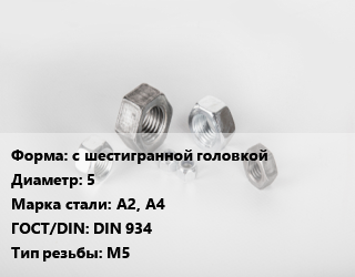 Гайка с шестигранной головкой D=5 Сталь: А2, А4 DIN 934 М5