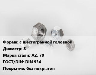 Гайка с шестигранной головкой D=8 Сталь: А2, 70 DIN 934 без покрытия