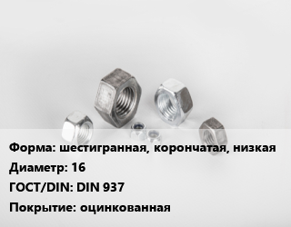 Гайка шестигранная, корончатая, низкая D=16 DIN 937 оцинкованная, шт цена от 10.32 сом / кг, где купить, условия доставки в Бишкеке и Чуйской области