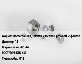 Гайка шестигранная, низкая, с мелкой резьбой, с фаской D=12 Сталь: А2, А4 DIN 439 М12