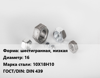 Гайка шестигранная, низкая D=16 Сталь: 10Х18Н10 DIN 439