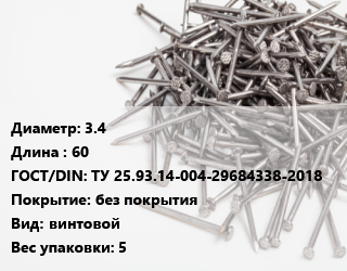 Гвоздь 3.4х60 ГОСТ: ТУ 25.93.14-004-29684338-2018 без покрытия винтовой 5