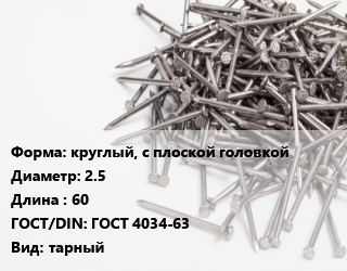 Гвоздь круглый, с плоской головкой 2.5х60 ГОСТ: ГОСТ 4034-63 тарный