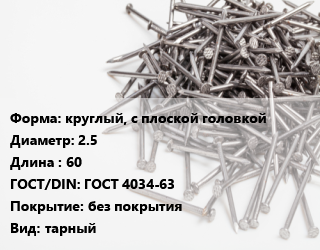 Гвоздь круглый, с плоской головкой 2.5х60 ГОСТ: ГОСТ 4034-63 без покрытия тарный