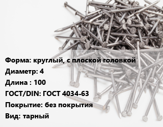 Гвоздь круглый, с плоской головкой 4х100 ГОСТ: ГОСТ 4034-63 без покрытия тарный