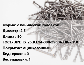 Гвоздь с конической головкой 2.5х50 ГОСТ: ТУ 25.93.14-008-29684338-2018 оцинкованный ершеный 1