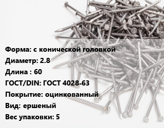 Гвоздь с конической головкой 2.8х60 ГОСТ: ГОСТ 4028-63 оцинкованный ершеный 5