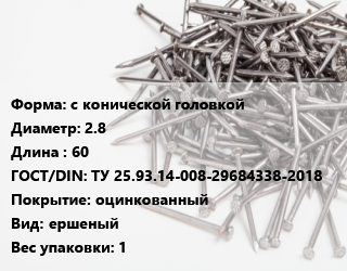 Гвоздь с конической головкой 2.8х60 ГОСТ: ТУ 25.93.14-008-29684338-2018 оцинкованный ершеный 1