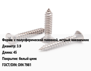 Саморез с полусферической головкой, острый наконечник D=3.9 L=45 белый цинк ГОСТ: DIN 7981