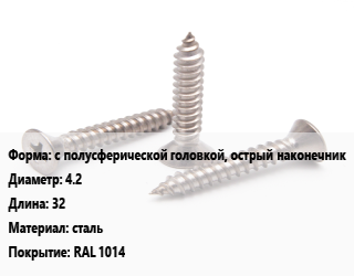 Саморез с полусферической головкой, острый наконечник D=4.2 L=32 сталь RAL 1014