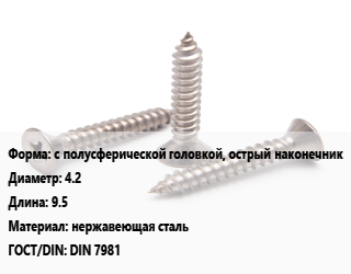 Саморез с полусферической головкой, острый наконечник D=4.2 L=9.5 нержавеющая сталь ГОСТ: DIN 7981