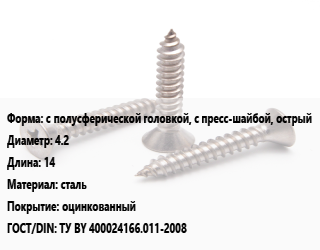 Саморез с полусферической головкой, с пресс-шайбой, острый D=4.2 L=14 сталь оцинкованный ГОСТ: ТУ BY 400024166.011-2008
