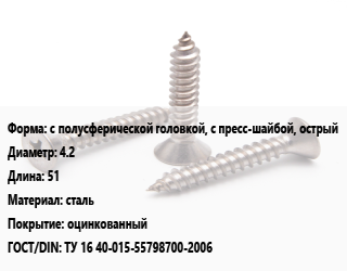 Саморез с полусферической головкой, с пресс-шайбой, острый D=4.2 L=51 сталь оцинкованный ГОСТ: ТУ 16 40-015-55798700-2006