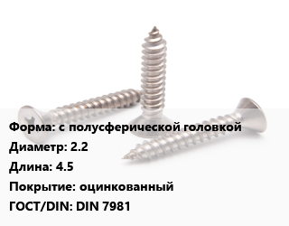 Саморез с полусферической головкой D=2.2 L=4.5 оцинкованный ГОСТ: DIN 7981