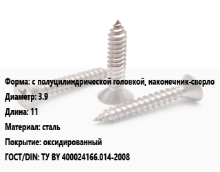 Саморез с полуцилиндрической головкой, наконечник-сверло D=3.9 L=11 сталь оксидированный ГОСТ: ТУ BY 400024166.014-2008