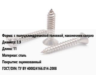 Саморез с полуцилиндрической головкой, наконечник-сверло D=3.9 L=11 сталь оцинкованный ГОСТ: ТУ BY 400024166.014-2008