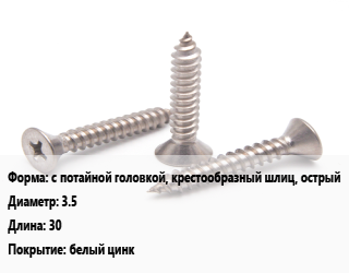 Саморез с потайной головкой, крестообразный шлиц, острый D=3.5 L=30 белый цинк