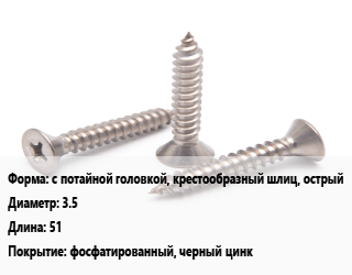 Саморез с потайной головкой, крестообразный шлиц, острый D=3.5 L=51 фосфатированный, черный цинк