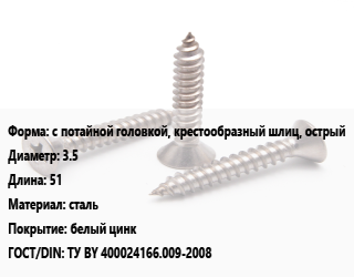 Саморез с потайной головкой, крестообразный шлиц, острый D=3.5 L=51 сталь белый цинк ГОСТ: ТУ BY 400024166.009-2008