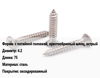 Саморез с потайной головкой, крестообразный шлиц, острый D=4.2 L=75 сталь оксидированный