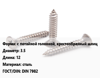 Саморез с потайной головкой, крестообразный шлиц D=3.5 L=12 сталь ГОСТ: DIN 7982