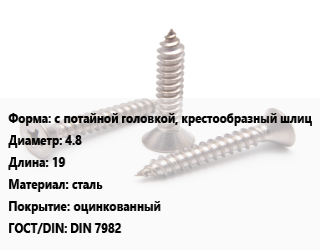 Саморез с потайной головкой, крестообразный шлиц D=4.8 L=19 сталь оцинкованный ГОСТ: DIN 7982