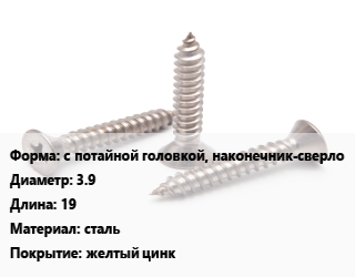 Саморез с потайной головкой, наконечник-сверло D=3.9 L=19 сталь желтый цинк