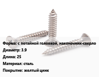 Саморез с потайной головкой, наконечник-сверло D=3.9 L=25 сталь желтый цинк