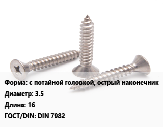 Саморез с потайной головкой, острый наконечник D=3.5 L=16 ГОСТ: DIN 7982