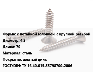 Саморез с потайной головкой, с крупной резьбой D=4.2 L=70 сталь желтый цинк ГОСТ: ТУ 16 40-015-55798700-2006