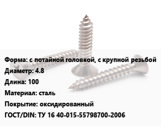 Саморез с потайной головкой, с крупной резьбой D=4.8 L=100 сталь оксидированный ГОСТ: ТУ 16 40-015-55798700-2006