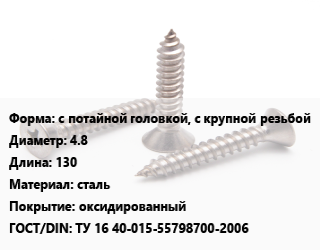 Саморез с потайной головкой, с крупной резьбой D=4.8 L=130 сталь оксидированный ГОСТ: ТУ 16 40-015-55798700-2006