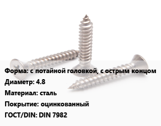 Саморез с потайной головкой, с острым концом D=4.8 сталь оцинкованный ГОСТ: DIN 7982