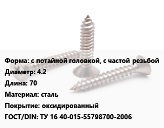 Саморез с потайной головкой, с частой резьбой D=4.2 L=70 сталь оксидированный ГОСТ: ТУ 16 40-015-55798700-2006