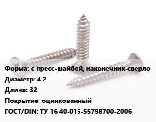 Саморез с пресс-шайбой, наконечник-сверло D=4.2 L=32 оцинкованный ГОСТ: ТУ 16 40-015-55798700-2006