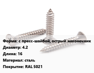 Саморез с пресс-шайбой, острый наконечник D=4.2 L=16 сталь RAL 5021