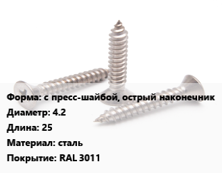 Саморез с пресс-шайбой, острый наконечник D=4.2 L=25 сталь RAL 3011