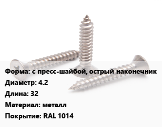 Саморез с пресс-шайбой, острый наконечник D=4.2 L=32 металл RAL 1014