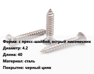 Саморез с пресс-шайбой, острый наконечник D=4.2 L=40 сталь черный цинк